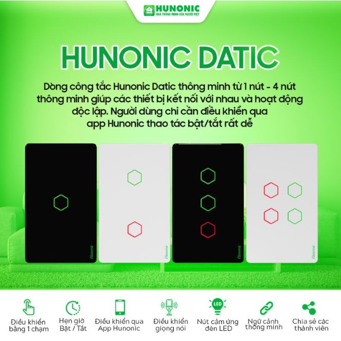 Hướng tới mục tiêu mang công nghệ hiện đại đến với mọi người dùng Việt, Hunonic đã cho ra đời dòng công tắc cảm ứng Hunonic Datic.Với thiết kế tinh tế, hiện đại cùng mức giá hợp lý, công tắc cảm ứng mới này không chỉ mang lại sự tiện nghi mà còn giúp tiết kiệm chi phí lắp đặt cho gia đình.