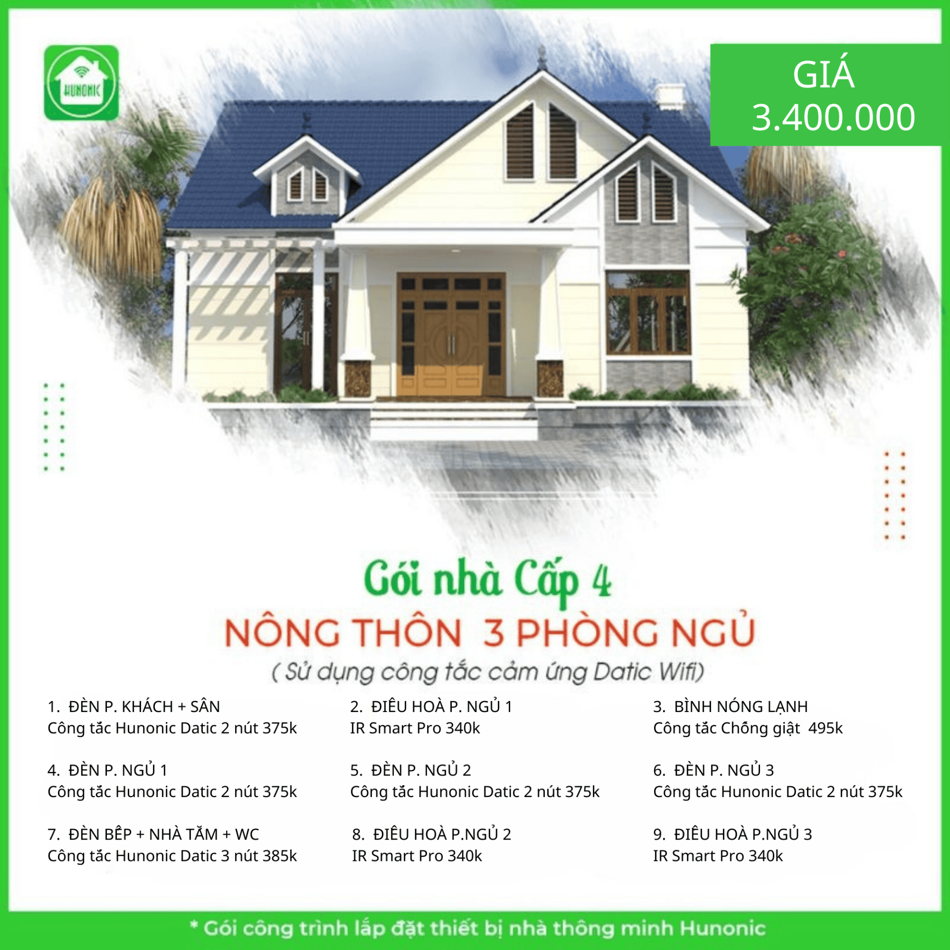 Với gói nhà thông minh Hunonic sử dụng công nghệ WIFI dành cho nhà nông thôn có 3 phòng ngủ, sản phẩm của chúng tôi gồm có các công tắc cảm ứng thông minh, thay thế toàn bộ công tắc cơ truyền thống.